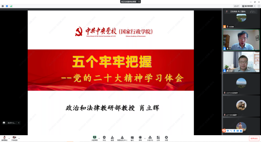 王雷华总结谈到,党的二十大报告是马克思主义的纲领性文献,是党和人民智慧的结晶。肖立辉教授从历史和现实的维度高度解读了党的二十大报告的主要精神,内容丰富,站位高远。王雷华对书院所有入党积极分子和支部党员提出了要求,指出要将党的二十大精神反复深入学,结合历史学,结合实际学,做到常学常新,把思想和行动统一到习近平新时代中国特色社会主义思想上来,统一到中央和公司党委的决策部署上来。希望大家在当前疫情防控形势下,能够结合中国共产党在疫情防控工作中体现出的人民至上的精神和品质,在自己学习和工作岗位上发挥好先锋模范作用,不断提升自己的理论水平,在思想和行动上不断向党组织靠拢。
