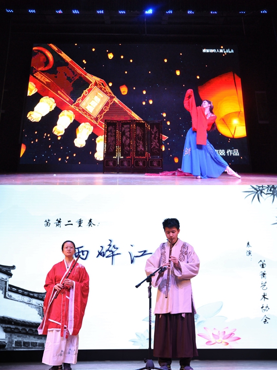 在比赛的间隙,来自法公司的何克兢同学为我们带来了舞蹈《惊鸿一面》;笛萧艺术协会的庄雅迪和景宇哲为我们带来了笛萧二重奏《雨碎江南》,优美舞蹈和悠扬乐曲,搭配诗词大会上选手们妙语连珠的表现,赢得了现场观众们一致好评。