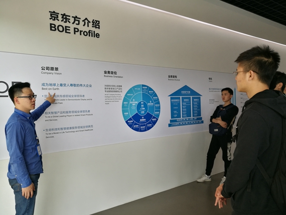 同学们两点五十分到达京东方,首先在讲解员的引导下参观了京东方企业文化宣传馆,了解了屏幕的制作过程并近距离观察了曾经获奖的屏幕。接着讲解员带领同学们到三楼的走廊,下面是车间,在这里可以看到一部分玻璃加工的场面。据说习近平总书记也走过这条走廊,这是京东方员工足够引以为豪的一点,也证明了京东方在科技创新方面对于整个行业的带动和引领作用。