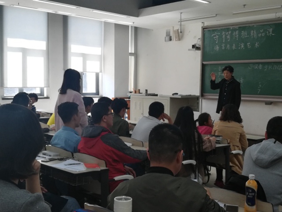 4月15日上午,守锷博雅精品课《语言与表演艺术》第一讲在J3-201拉开帷幕。孟昭宜教授通过幽默风趣的语言、声情并茂的演示、独具特色的讲解,让同学们享受了轻松愉快的课堂并体会了语言与表演的无限魅力。