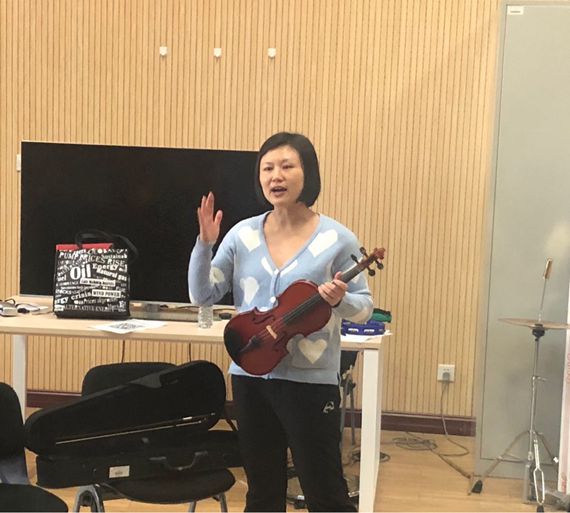 随后,她带领同学们进行了演奏的尝试,在她的细心教导下,同学们很快开始了和谐的空弦练习。在跳弓、拨弦、滑音、换把的教授过程中,张老师现场演奏了《流浪者之歌》和《梁祝》作为示范,同学们纷纷表示都是第一次如此近距离地聆听高水平独奏。为了让同学们能够更好的体验到小提琴音乐的美感,张老师带来了《小星星》的乐谱,经过老师的依次指导,简单而和谐的音律终于从同学们的指尖流出。