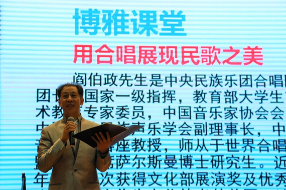 阎伯政教授是中央民族乐团合唱团团长,国家一级指挥,教育部老员工艺术教育专家委员,中国音乐家协会会员,中国少数民族声乐学会副理事长,中国音乐公司客座教授,师从于世界合唱联盟协会主席萨尔斯曼的博士研究生。他不仅在艺术上有很高的成就,在历史人文方面也有独到的见解,对中国民族歌曲的演变与特色的分析诠释深入浅出,令人印象深刻。