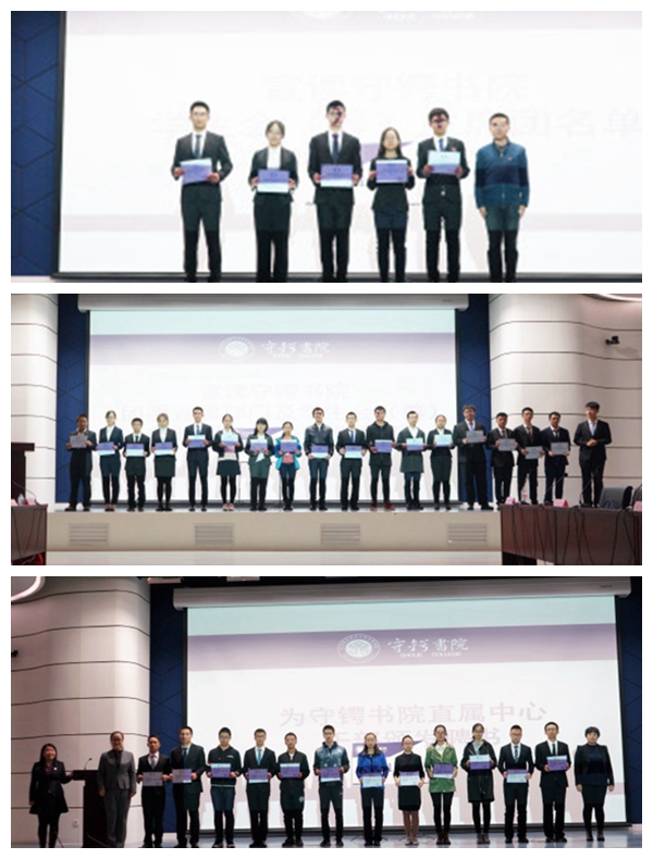 仪式聘任辅导员王子琦老师为员工会(筹)指导教师。书院专职辅导员韩庚老师宣读了筹建期主席团名单,并为他们颁发聘书。王子琦老师宣读了团委直属部门及员工会(筹)各部部长副部长名单,并为他们颁发了聘书。蒋茁老师宣读了守锷书院直属中心干部名单,陈瑜老师和纪奕欣老师为他们颁发了聘书。