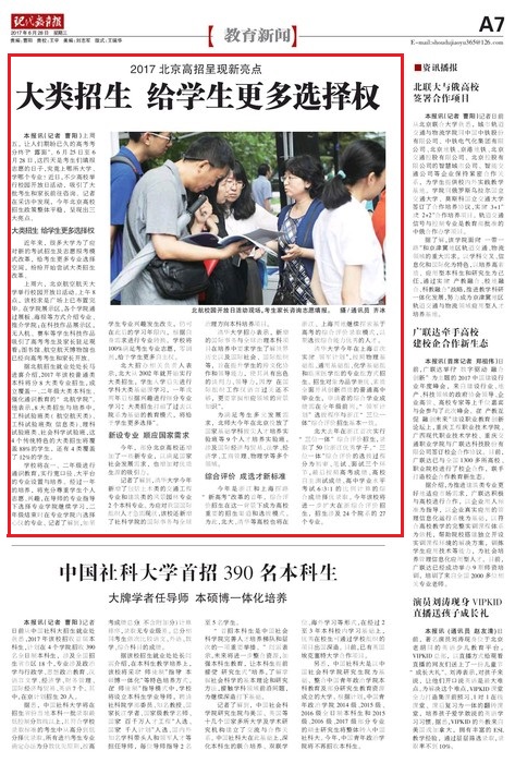 《现代教育报》2017年6月28日报道2017北京高招呈现新亮点,其中大篇幅报道了公司的大类招生: