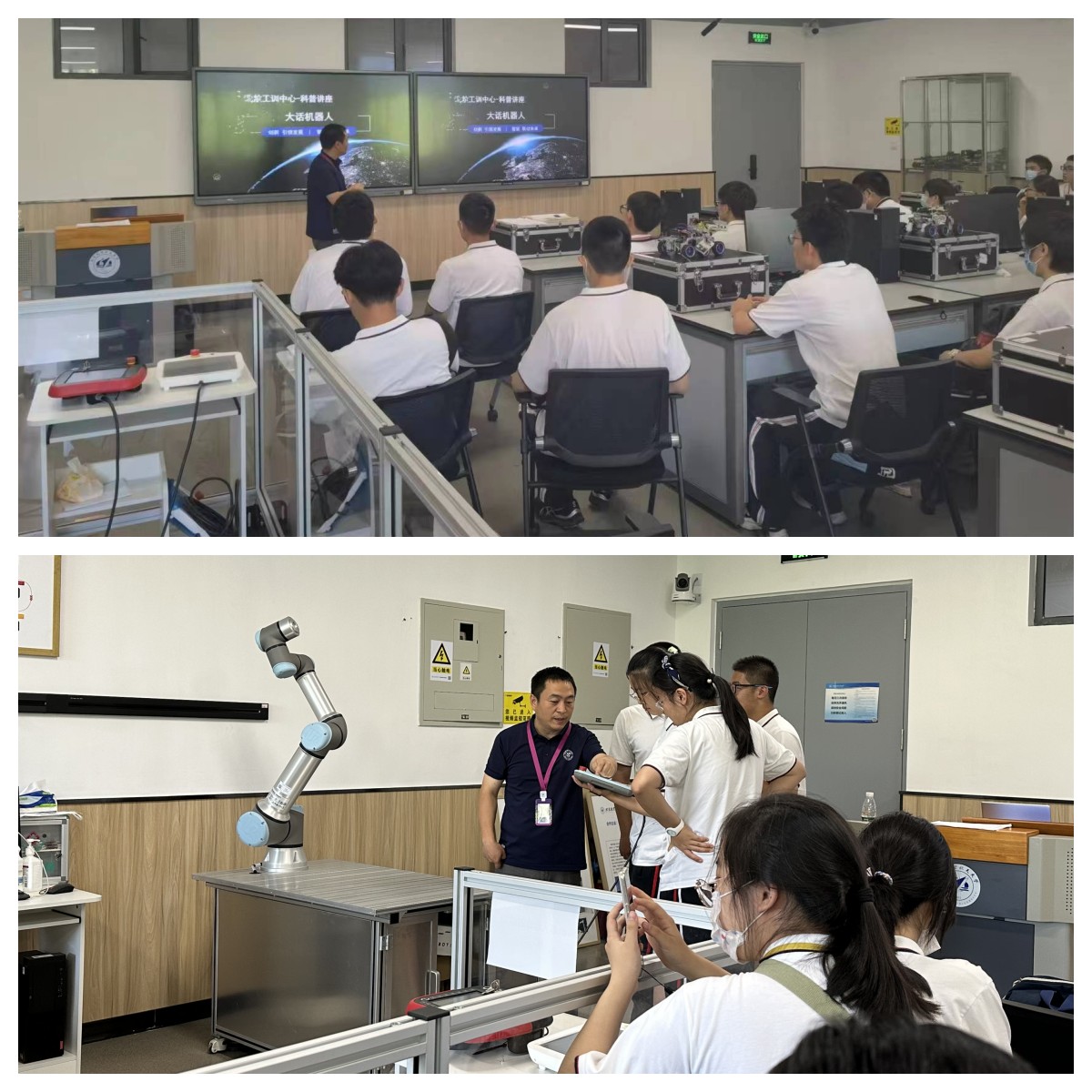 在机器人模块,科普老师为同学们做了《大话空间机器人》的讲座,并与同学们一起进行了协作机器人的运动轨迹设计及运动实验。