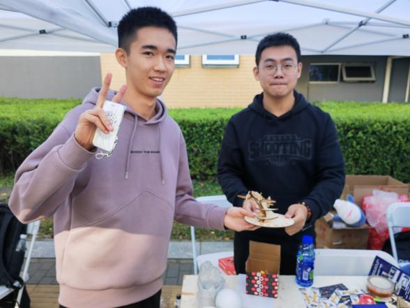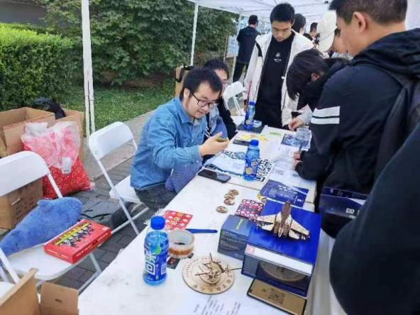 在此次招新外场活动中,社团成员准备了许多精美礼品,其中包括社团文创马克杯、文创卡套、文创U盘、小夜灯和鲨鱼抱枕等。此外,社员们运用激光切割技术,亲手制作了精美徽章、“北京一号”模型和轰炸机模型,并将这些模型作为游戏特等奖全部赠送给了同学们。