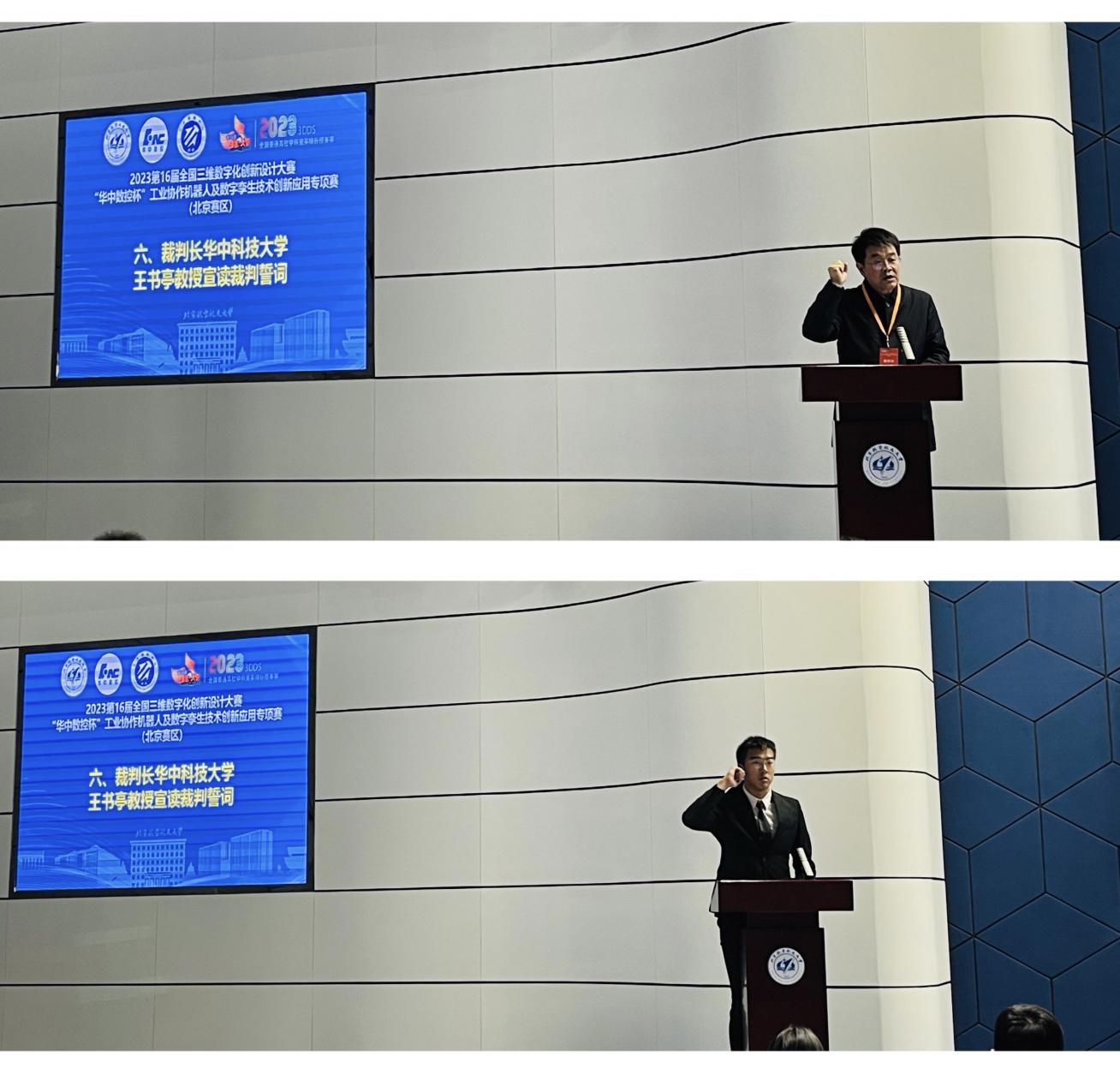 裁判长华中科技大学王书亭教授,参赛员工代表yl9193永利集团王政鑫分别代表裁判组和参赛选手宣誓。