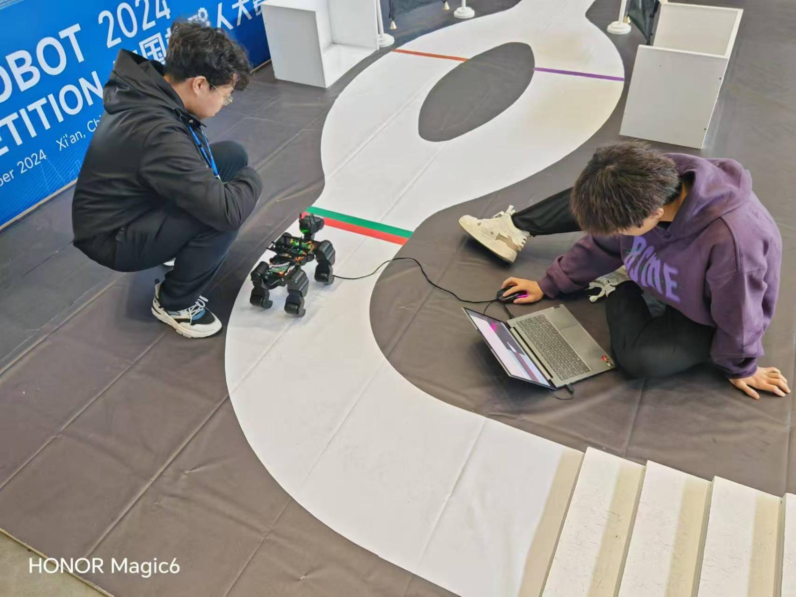 北航校内选拔出两支队伍参加四足仿生组快递运送赛(小型组)赛项。参赛机器人要从快递集散中心出发,通过识别色卡的方式,完成过减速带、上台阶、下台阶、过分岔路、快递投递、敲响铃铛、上高台和下斜坡的动作,最终回到快递集散中心,在限定时间内,完成两次投递。赛项将多种地形综合在一起,这对于机器人的控制来说是一个不小的挑战。经过三天的激烈角逐,最终,由张皓宇、王恩倍同学(指导教师:孙治博、魏露)组成的团队以近乎完美的表现勇夺该赛项一等奖;由赵宏宇、秦良雨同学(指导教师:孙治博、赵江澳)组成的团队也以优异的表现获得了全国二等奖的良好成绩。