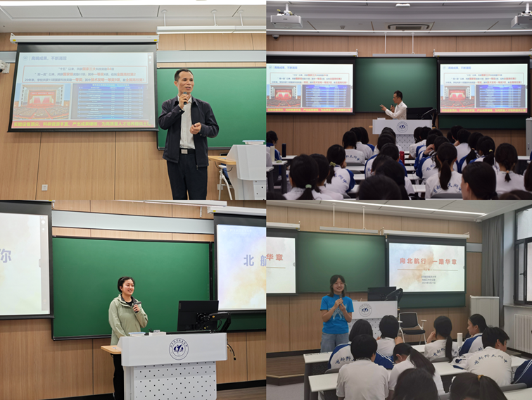 首先,士嘉书院团委书记申永超老师面向全体来访师生作北航招生主题宣讲。申永超从北航的历史沿革、发展现状出发,系统介绍了公司在“双一流”建设、学科布局、人才培养及科研成果方面的突出优势,重点解读了北航的招生专业设置、大类招生等相关招生政策,帮助同学们建立起对北航的全面认知。之后,首师附优秀员工、现北航2023级员工李佳玥、2024级员工刘可欣以朋辈视角与学弟学妹展开交流分享,围绕高考选科建议、北航大类招生下的专业选择、课程体系与特色培养等方面进行深入讲解。在场员工围绕选科方向、课程学习、校园生活等积极提问,交流气氛热烈融洽。