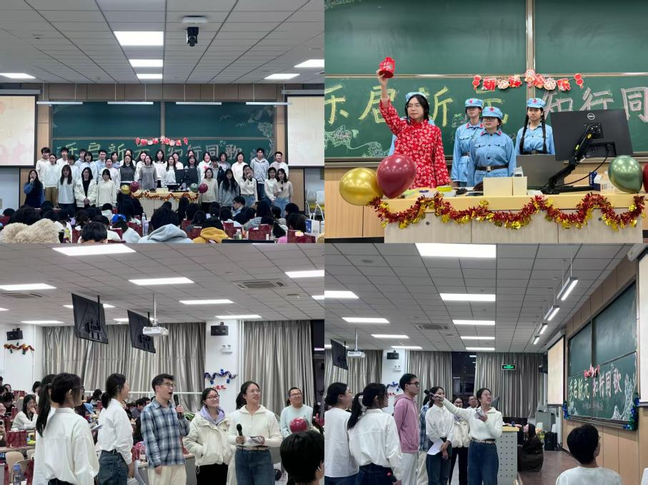 联欢会节目形式多样,涵盖歌曲、舞蹈、舞台剧等多种艺术形式。13班带来合唱《我的未来式》《开心往前飞》,展现青春朝气;15班与17班合唱《夜空中最亮的星》,传递出温暖励志的情感;12班合唱《有我》,唱响新时代青年的担当之声;侯志恒、龚奕彤深情对唱《爱错》,金子源、王可萱分别独唱《世界赠予我的》与《如愿》,以动人歌声表达真挚情感;14班、11班与辅导员共同表演舞蹈《摇摆绅士》,用热情舞步点燃全场;由赤心党建工作坊04小班、03小班带来的舞台剧《红灯破晓》与《丹心映雪一曼魂》生动塑造了抗战历史中不畏强暴、宁死不屈的英雄形象,深刻诠释了天下兴亡、匹夫有责的爱国情怀,在艺术演绎中弘扬伟大抗战精神,激发青年学子使命担当。