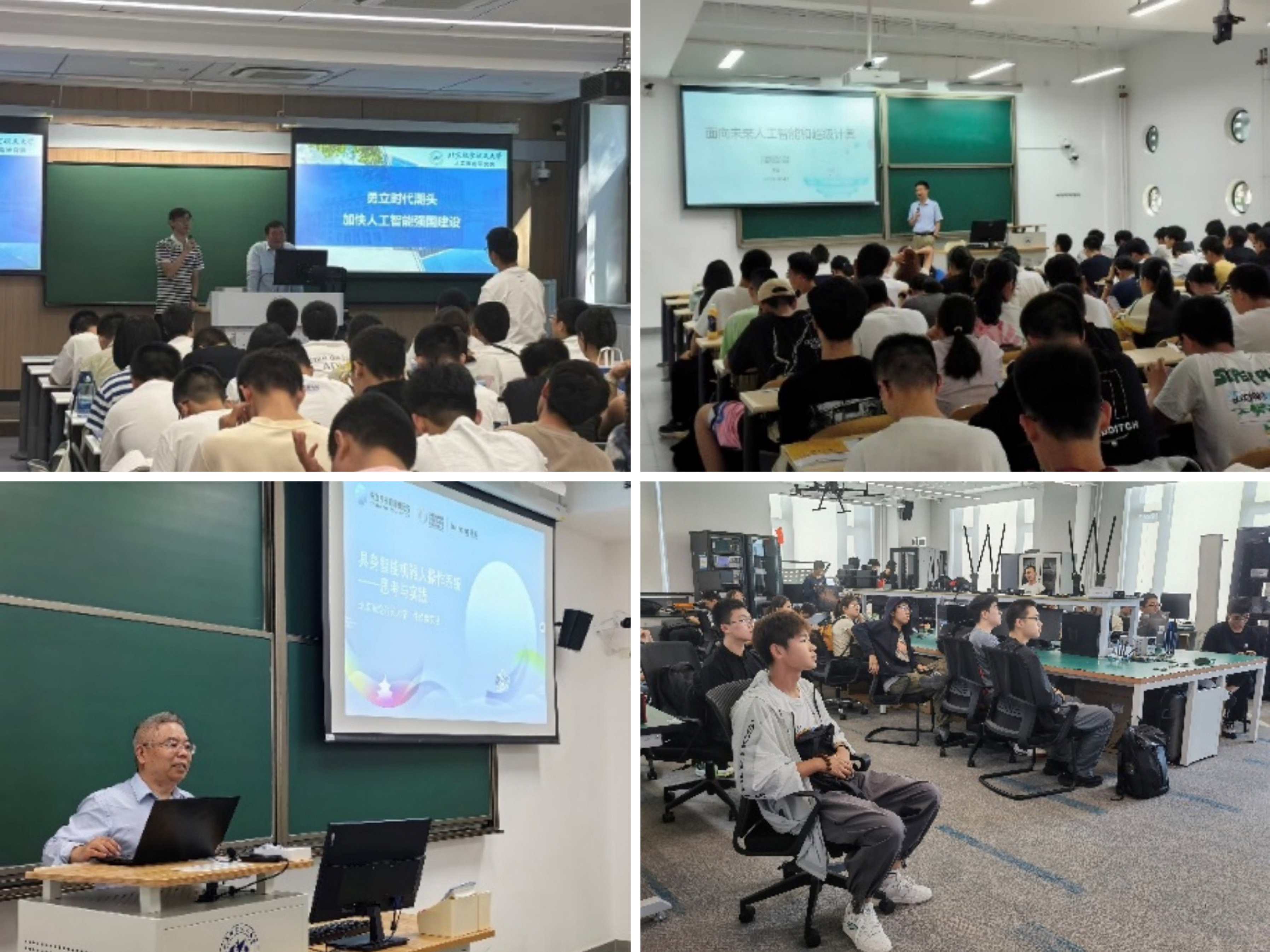 计算与智能科学类各专业公司带领同学们深入公司重点实验室,近距离接触行业前沿技术与科研成果。计算机公司李波老师为同学们作《面向未来人工智能和超级计算》主题讲座,深入探讨了AI的局限性,同时强调了计算机学科与其他领域的跨学科合作潜力,并指出计算机学科与多学科交叉的重要性,展示了其在推动科技进步中的关键作用。软件公司副经理谭火彬老师介绍公司概况与培养方案,牛建伟、盛律、于茜、张晶四位老师分别分享了具身智能与机器人融合、大小脑协同模型、大模型赋能矢量图与草图理解、多模态大模型驱动Web UI Agent等前沿技术。网络空间安全公司高年级员工带领一年级新生参观各类实验室,沉浸式体验网络空间对抗与舆情管控的实战场景,近距离感受AI社交机器人账号的存在与舆情引导原理。人工智能公司(人工智能研究院)吴文峻老师以图灵测试等案例阐释了AI的概念与能力并回顾发展历程,强调了需求、算法、算力协同的重要性,重点介绍公司五大方向以及取得的重大成果,并向同学们介绍了公司以基础理论为核心、结合多领域技术与应用的育人体系。
