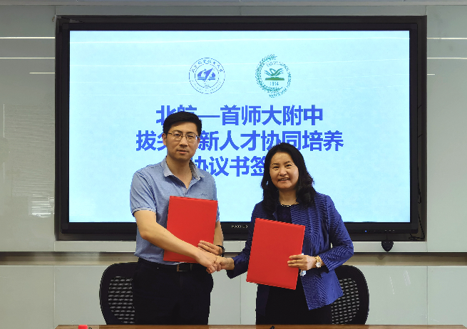 北航人才招聘处副处长张青竹从首师大附中员工升学北航情况、北航招生新变化、拔尖创新人才培养模式等方面介绍了北航招生工作开展情况。他表示,希望双方以此次签约为契机,深入开展合作,为航空航天事业发展培育优质创新性人才。首师大附中董事长助理任海霞介绍了首师大附中在素质教育、科技创新等方面的育人成果。任海霞表示,此次拔尖创新人才协同培养协议签署,是高校与中学在协同育人方面进行的有益尝试,希望双方能够积极协调优势资源,共同培育时代新人。会上,任海霞、张青竹分别代表双方进行签约。