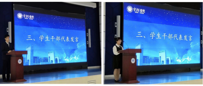 随着庄严的国歌缓缓奏响,大会正式开始。首先,由员工干部代表做主题发言。守锷书院分团委组织部部长何忧分享了自己在过去的一年时间里参与员工工作的感悟,他指出了员工干部应当担起的责任:树立良好的个人作风,做同学榜样、为集体服务;积极工作,架起书院各组织与员工沟通的桥梁;携起手来,合力营造书院的和谐氛围。作为新生的二大班班长李其玲则就当今时代背景,提出了对员工干部重要“三感”——集体荣誉感、责任感、使命感的理解。她认为,员工干部应保持对工作的热情、牢记职责之所在,将个人成长与集体的发展融为一体。