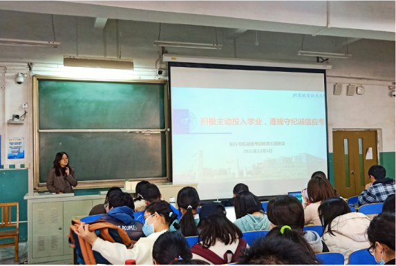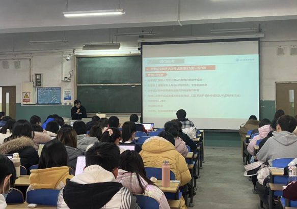 随后,辅导员陆睿结合员工手册向同学们具体讲解了作弊行为、违纪行为以及相应处分规则,并通过真实案例向同学们指出侥幸心理的危害,同时讲解了考场纪律等事宜,希望同学们诚信应考,做一名遵规守纪的老员工。