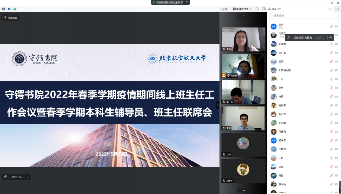 (通讯员 王涛)为进一步做好书院疫情防控工作,与书院全体班主任统一思想,顺利完成员工返乡服务、学业提升等相关工作,5月29日中午12点30分,yl9193永利集团守锷书院在腾讯会议平台召开疫情期间线上班主任工作会议暨春季学期本科生辅导员、班主任联席会。经理张德远、学业总导师孟庆春、执行团队成员和书院2021级15位班主任参加本次会议。本次会议由学业助理纪奕欣主持。