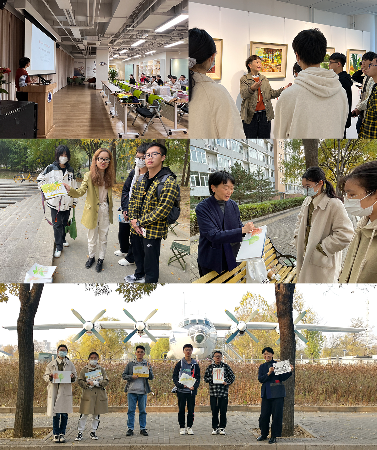 “手绘秋之美”美育兴趣课堂由新媒体艺术与设计公司副教授庄维嘉主讲,包含室内理论和室外实践两部分,带领同学们理解美、欣赏美、创作美。理论环节讲述了绘画的构图要素与色彩搭配,结合书院提供的水彩、彩铅等绘画工具讲解其特性和使用方法。实践环节组织员工参观“执着与美”作品展,带领员工踏访沙河校区,绘制心中最美的风景。指导教师对每一位同学的手绘画作进行了点评。