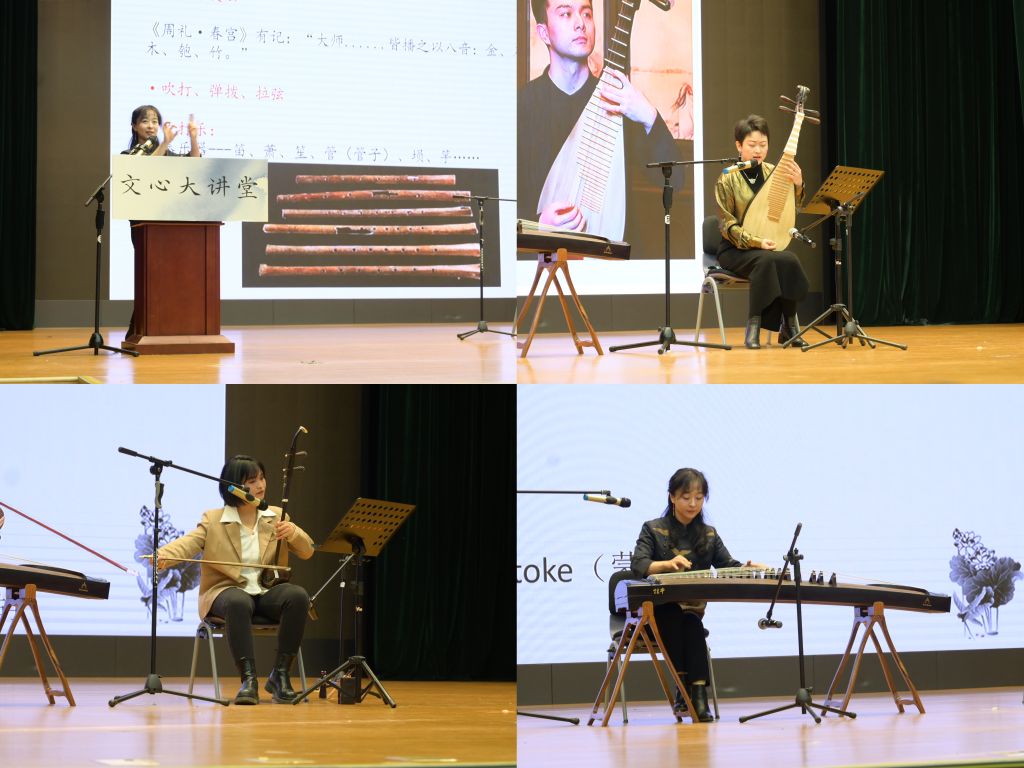 首先,王燮老师追溯中国古典乐器史迹前缘,带领同学共同赏析太空站中国航天员横跨光年万里的琴筝佳音。在演奏环节,王燮老师素手抚琴,以琴声猜索地域,有秦腔恣意,有汉街古韵,亦有浙南婉柔;陈甦超老师现场演绎原创的琵琶曲,一曲趣似方言俚语,一曲唱和伴生,慷慨激昂;庄玥老师则以一曲逍遥胡琴古调,雅俗共赏,使在场诸位恍若置身市井,感受音乐的趣味。课程通过知识梳理、现场演奏以及欣赏分析,引导员工们聆听音乐精品,与圣贤为友,携经典同行,感受中华民族屹立在世界舞台昂首于世的自信与底气,讲演在悠扬的琴声中圆满落幕。