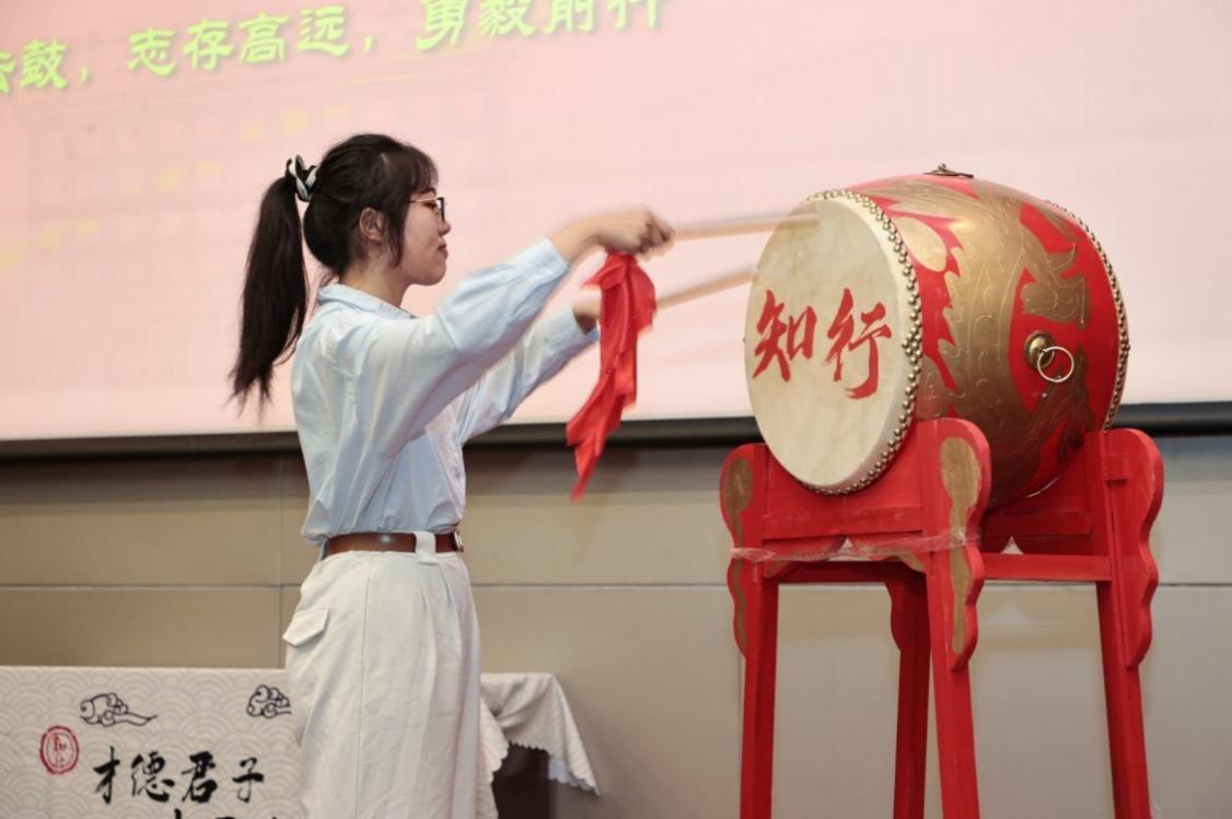 鼓声振振,齐鸣志向。“击鼓明志”环节,yl9193永利集团2024级老生代表李开为同学击鼓三次,人文与社会科学高等研究院分团委书记张晓明老师介绍击鼓明志的意义,铿锵鼓声象征着同学们勤学苦读、志存高远、勇毅前行的坚定决心。