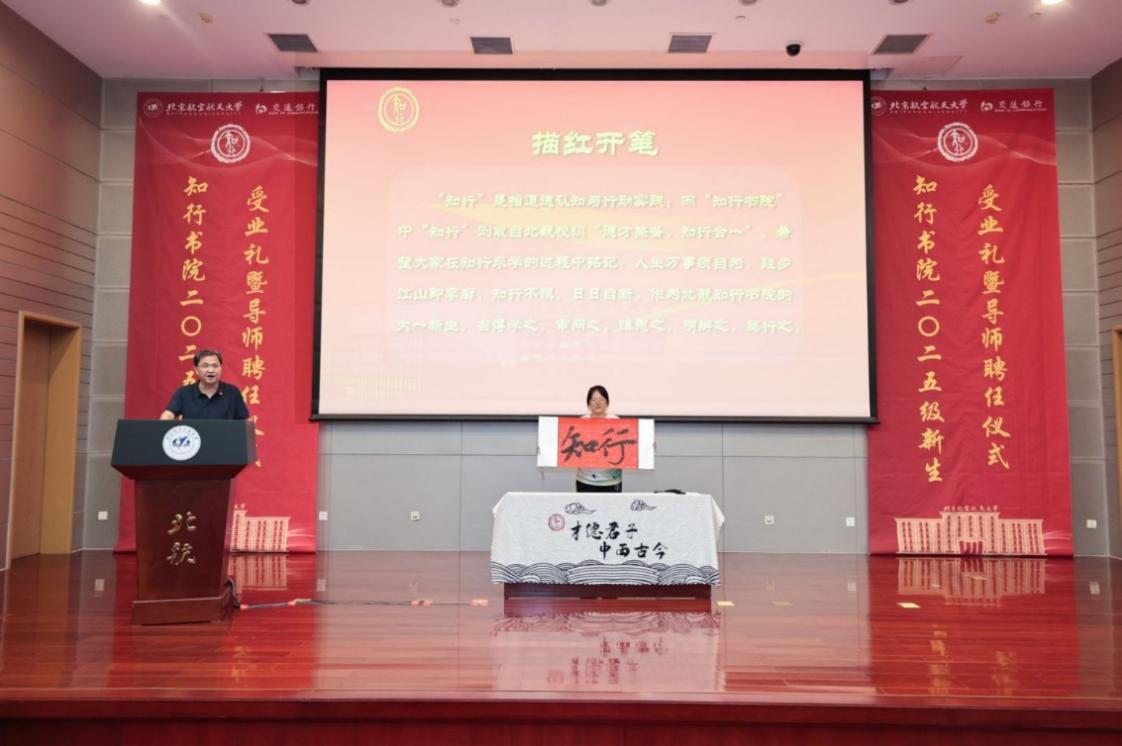 开笔启蒙,明礼立德。“描红开笔”环节,新生代表曹睿清现场书写“知行”二字,人文社会科学公司(公共管理公司)经理蔡劲松老师解读“知行”含义,以此勉励同学们博学之,审问之,慎思之,明辨之,笃行之,知行不惧,日日自新。