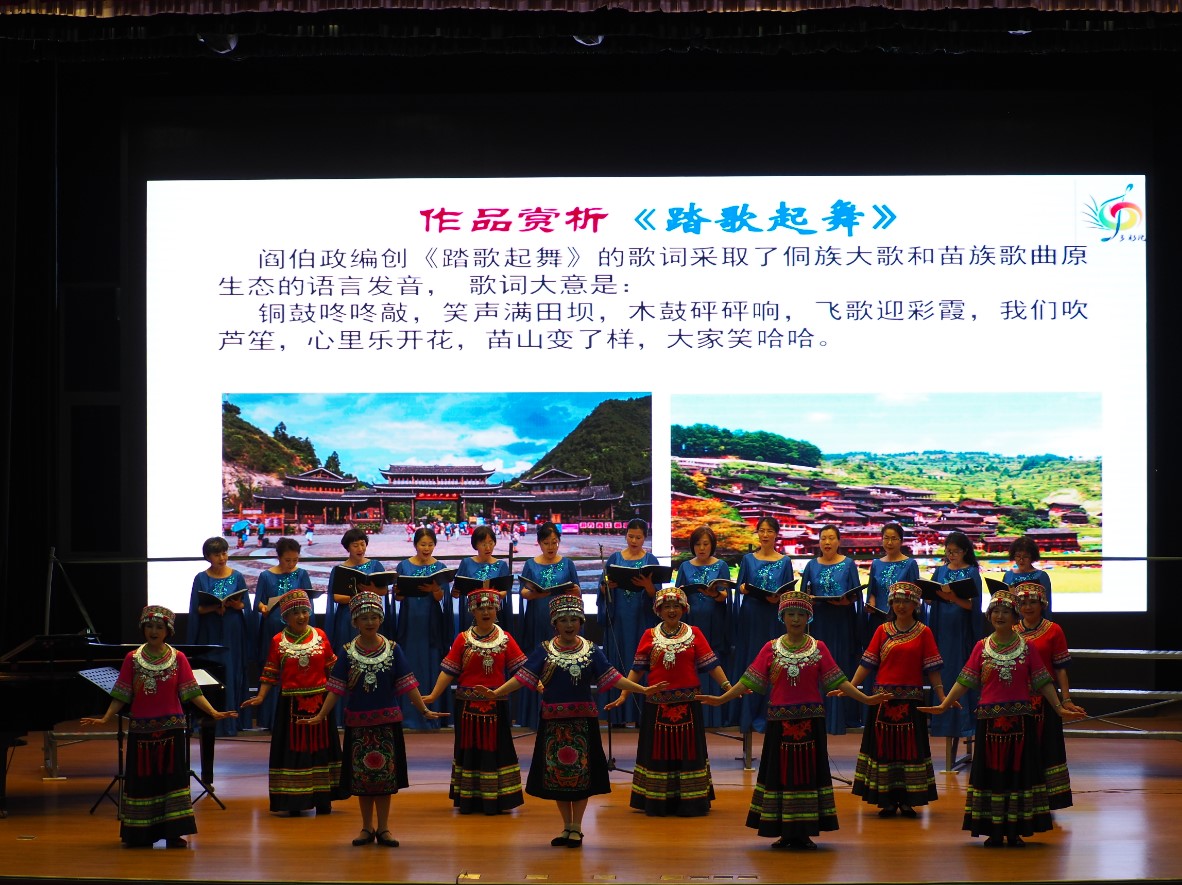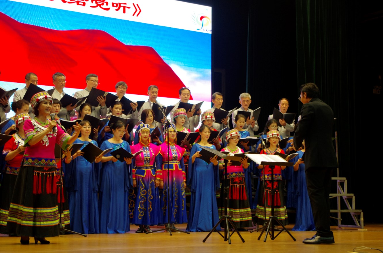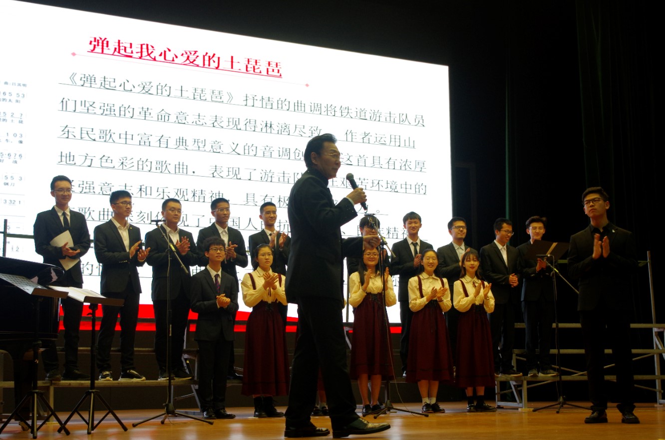 整场讲座由经典民歌,红色电影插曲以及展现时代风貌的创作歌曲等组成,以合唱和舞蹈的形式展开。从建党之初的《追寻》、《南湖颂》,到抗战时期的《毛委员与我们在一起》、《绣红旗》,再到新中国建设时期的《打靶归来》;从青海民歌《花儿与少年》,到少数民族歌曲《踏歌起舞》、《多彩酒歌》,再到各民族团结一心的大合唱《唱支山歌给党听》、《我和我的祖国》,在阎伯政老师的指挥下,多彩合唱团的歌声跨越了时间和地域,在此刻交融在一起。