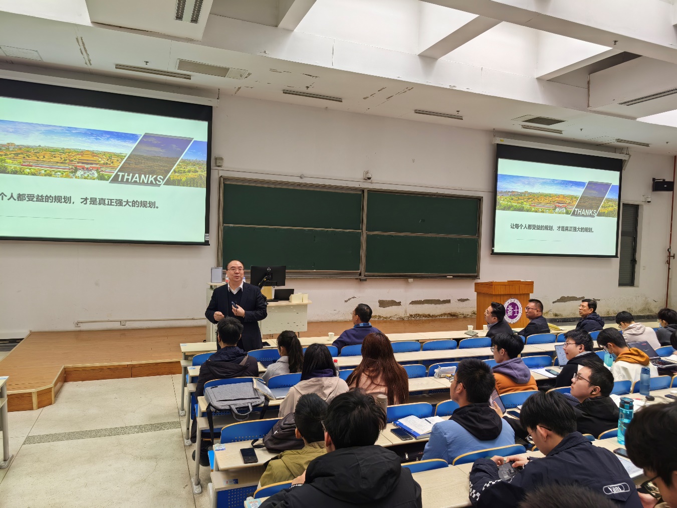 石晓冬经理从“尺度和视界”为大家解读 “规划”的内涵,让大家明白什么是新时代背景下的规划。他指出,规划需要科学地统筹山、水、林、田、城、人、岗、地、房、钱,在超大城市里,要科学地统筹好这些要素,规划起到龙头和引领作用。规划不仅涉及政策,也涉及居民的方方面面,包括政策制定、参与城市、改造城市、维护城市、建设城市等诸多方面。为帮助大家进一步了解规划的工作内容,石晓冬经理采用非线性结构的特殊叙事方式,详细讲述了四位规划师的成长历程。他们走进基层担当起自下而上社区行动的责任,他们利用现代科技绘制出方便每个人的规划蓝图,他们利用国际规划思维勾连起世界人民的文化交流,这些鲜活的案例让同学们看到了一个个伟大、富有创新活力的规划者。接着,石晓冬经理为大家展示了国土空间规划背景下的北京城市总体规划,让同学们了解了国土空间规划的工作内容。最后,石晓冬经理讲述了他从事规划工作的初心。他谈到,规划者不仅是天然的生态主义者、大地工作者更是社会主义者。规划治理中要坚持最初一公里的个体到群体的集中规划,才能在最后一公里达成群体到个体的具体化实施。只有每个人都因规划而受益,规划才是真正强大。