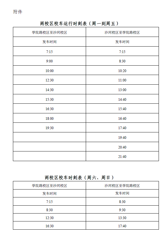根据沙河校区工作实际情况,结合公司后勤处《关于调整校车运行方案的通知》,经研究决定自2017年9月18日起,对两校区校车运行时刻进行调整。
